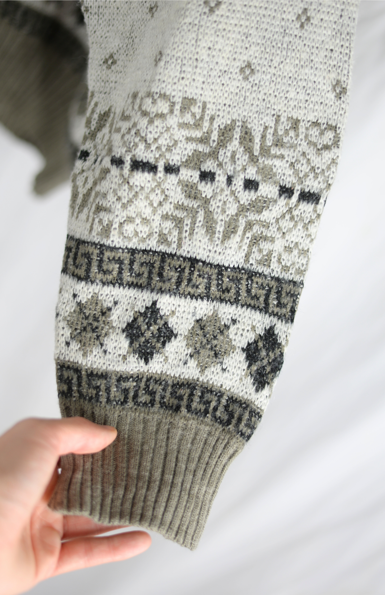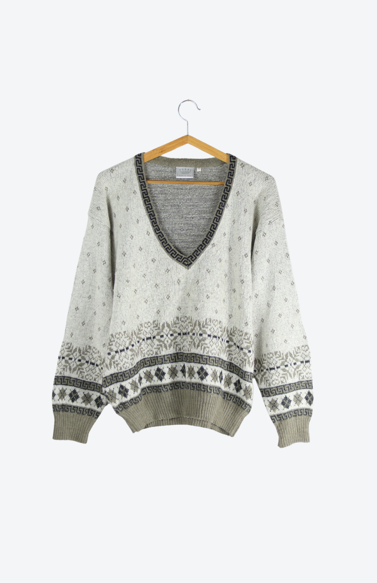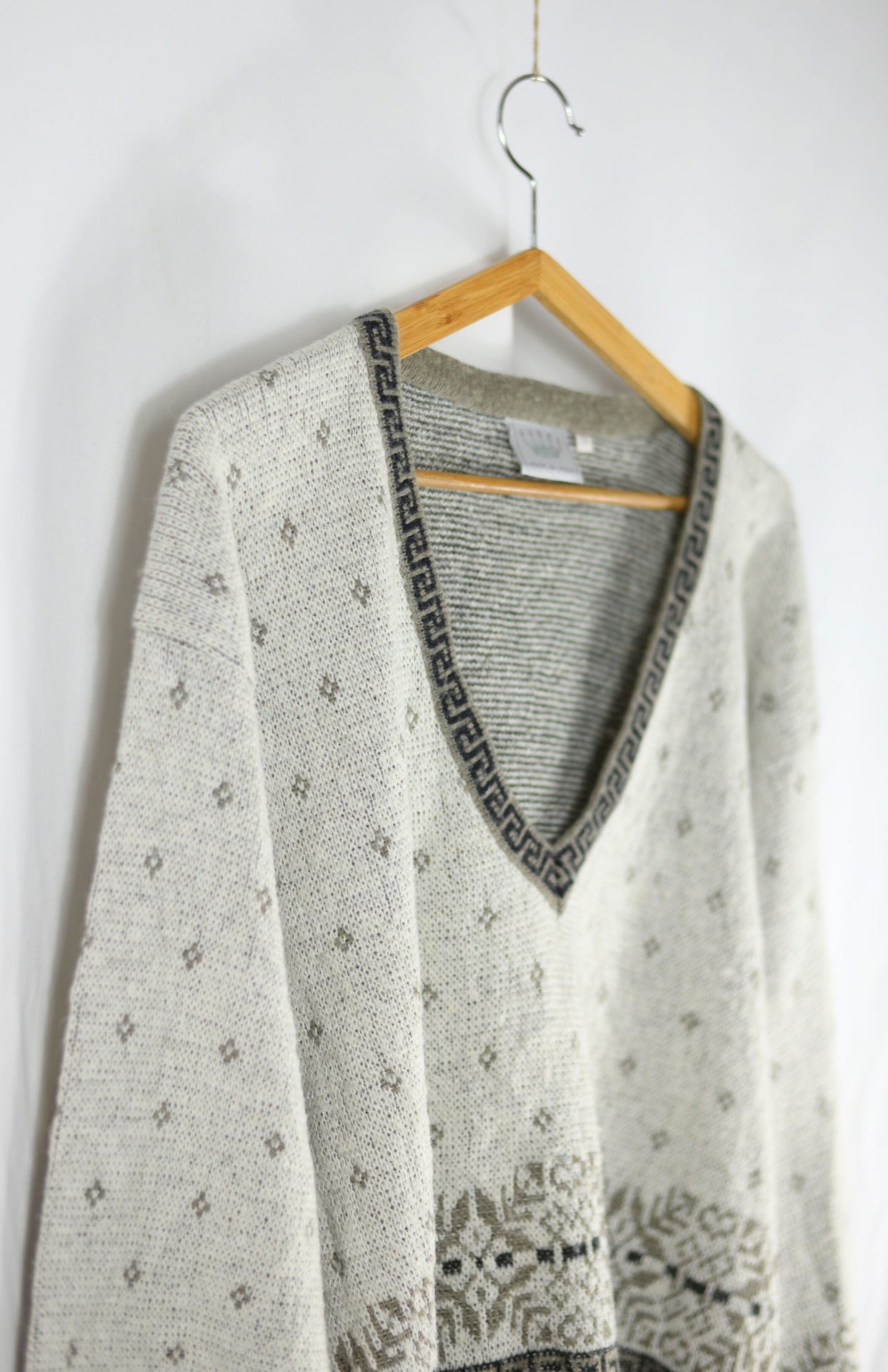 Krémový vlněný svetr s jemný a zimním vzorem. Má pěkný volný střih a hluboký výstřih, který vypadá krásně při vrstvení s košilemi. Střední úplet.