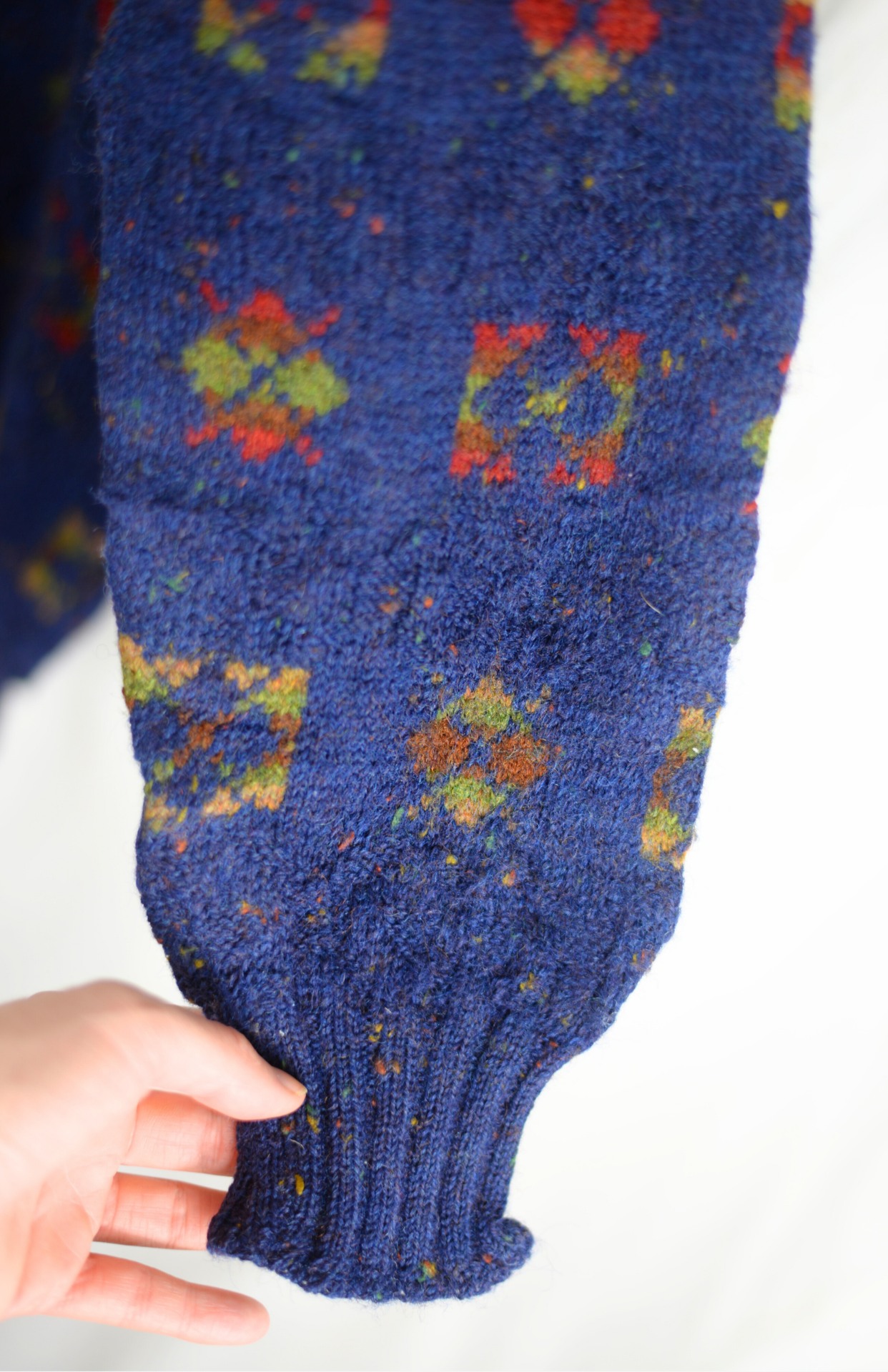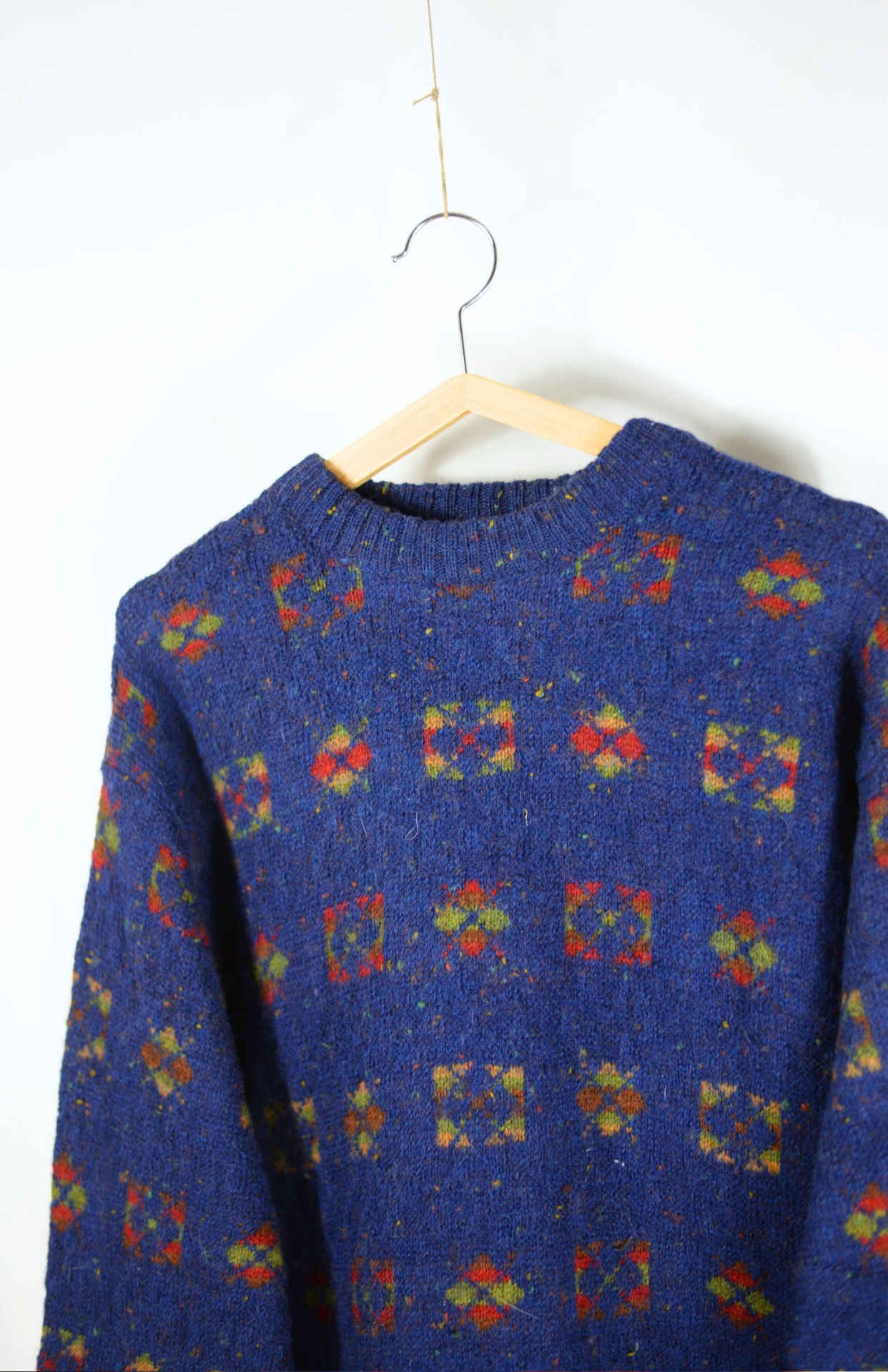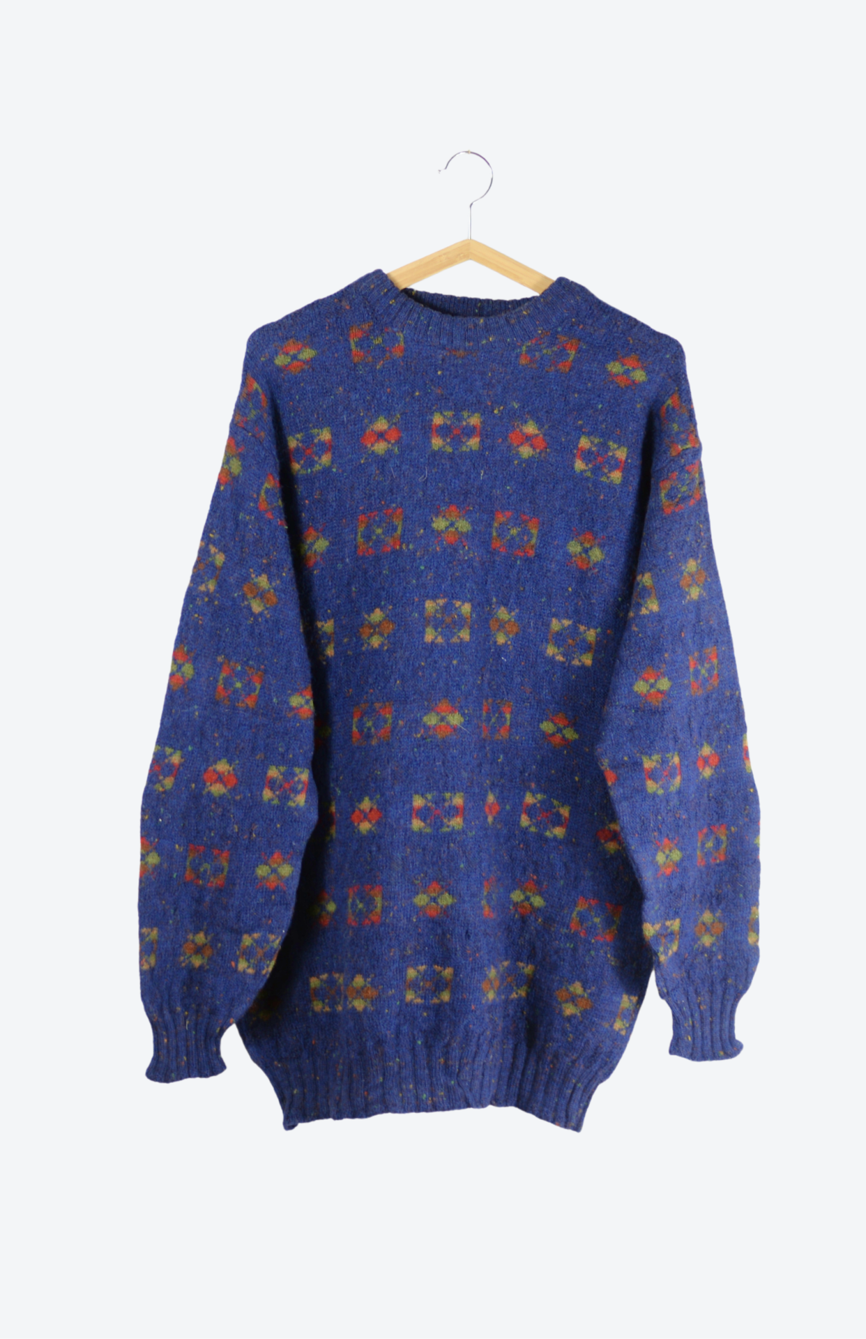 Vinatge svetr s funky barevným vzorem. Má nabíraný rukáv a středně silný úplet. Krásně teplý, má delší střih.