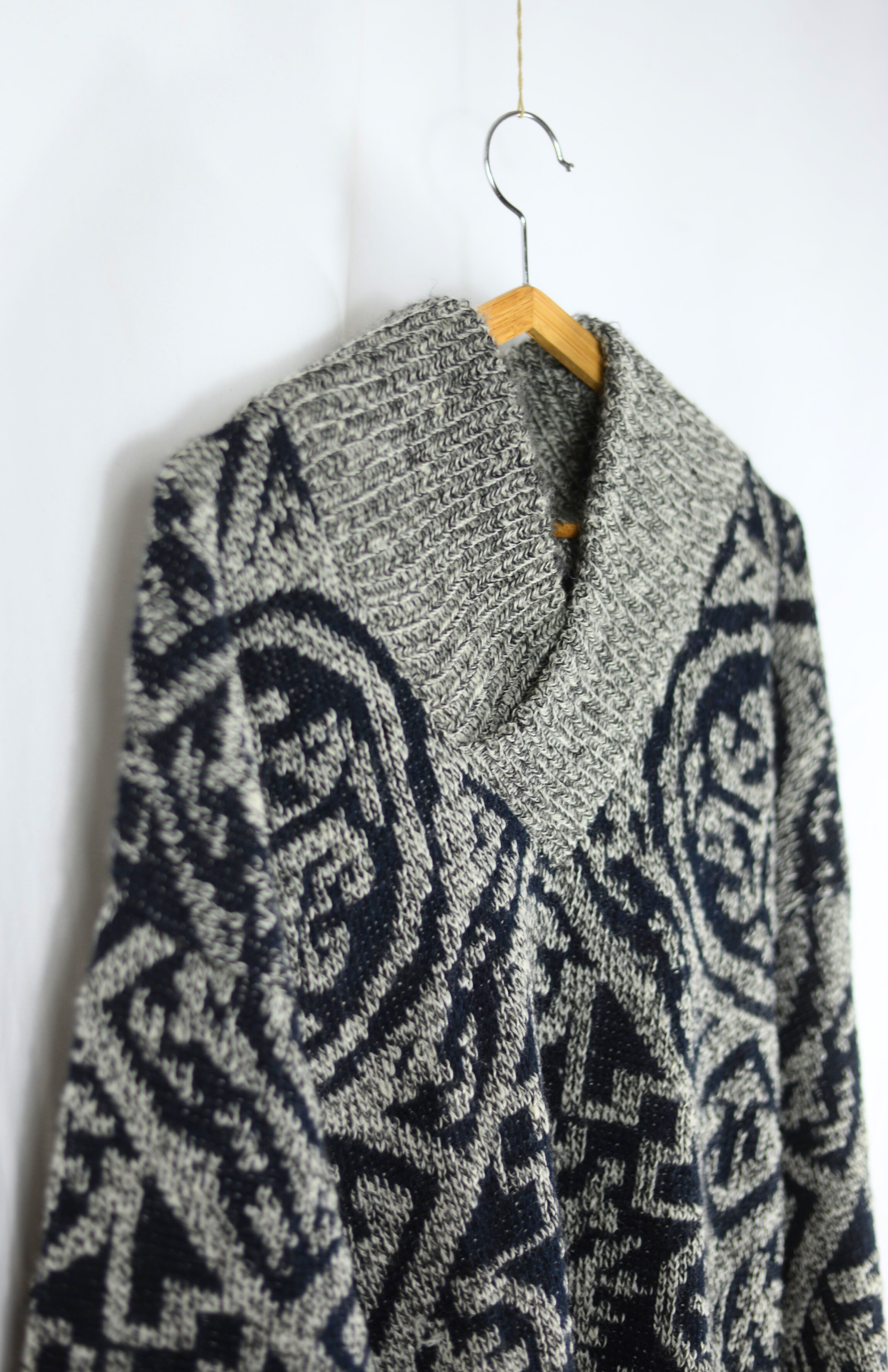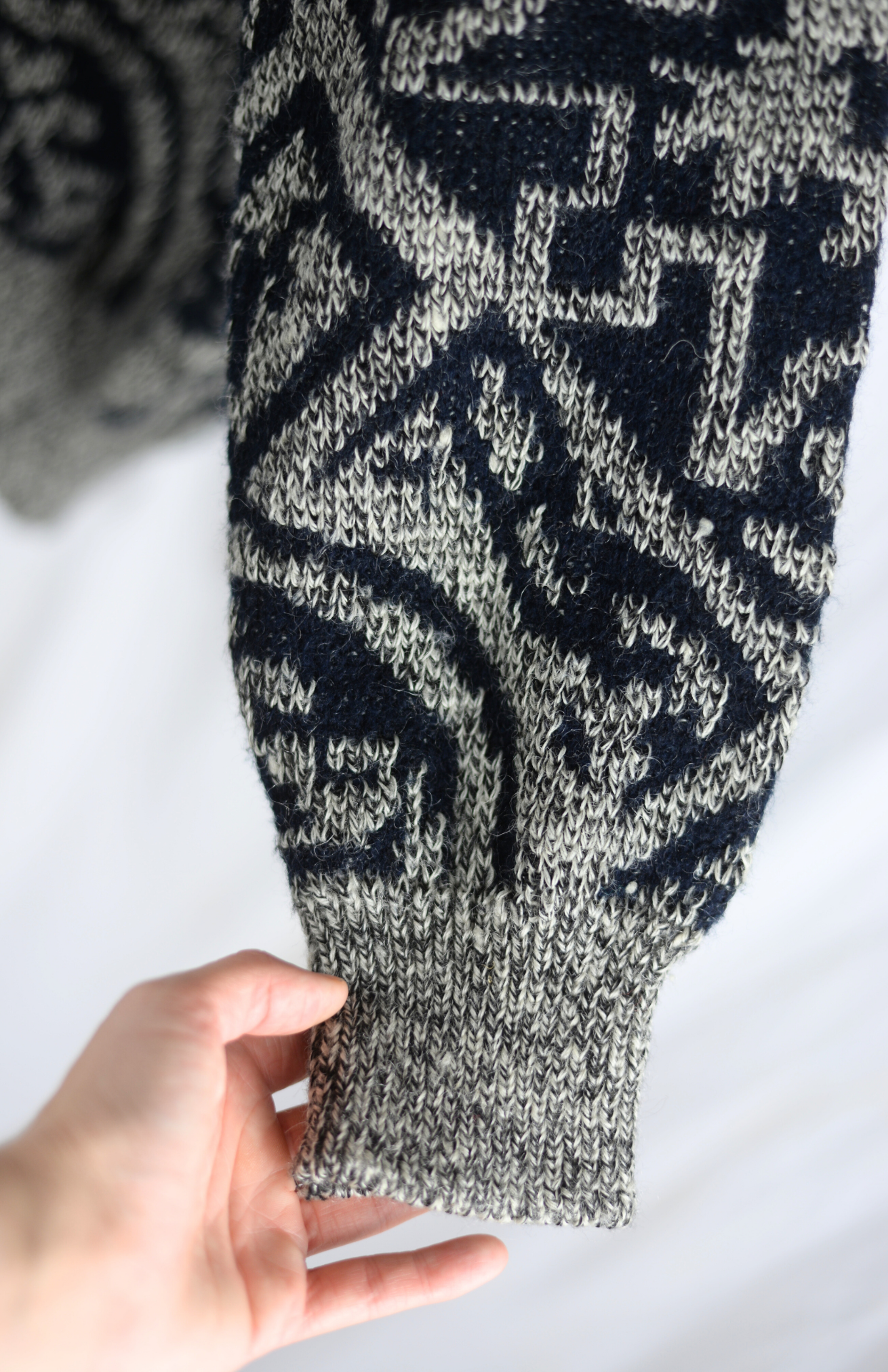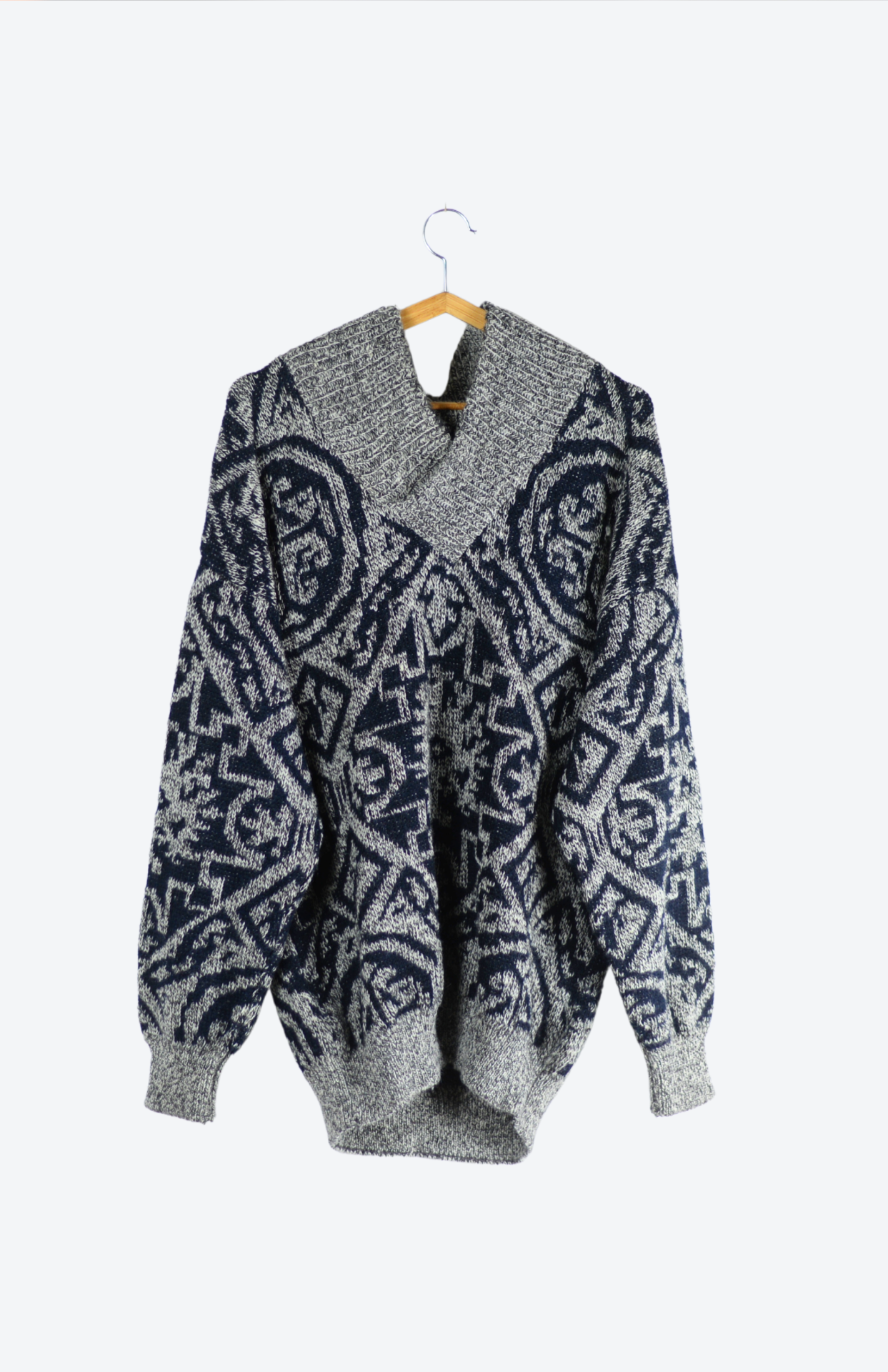 Silný vlněný retro svetr s výrazným ornamentálním vzorem. Má lehce nabíraný rukáv a límec ke krku. Unisex oversize kousek.