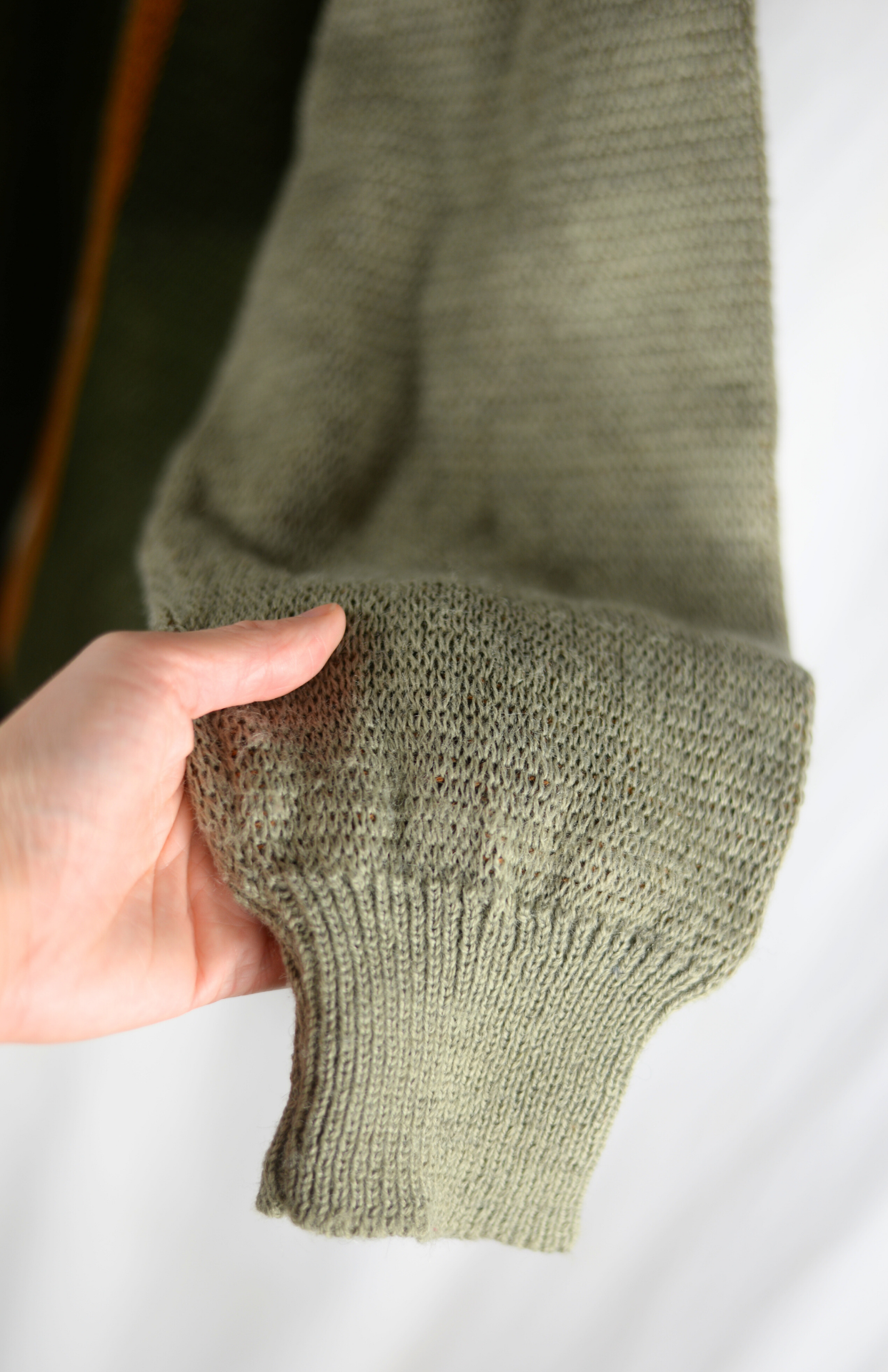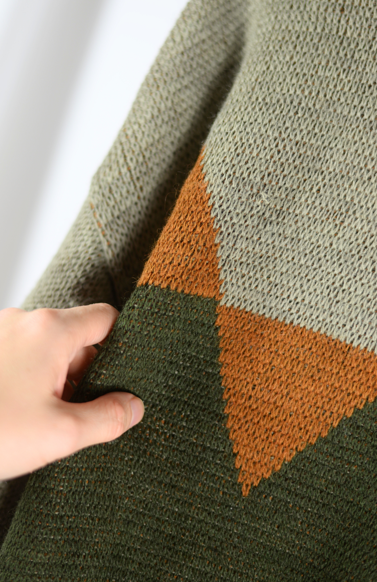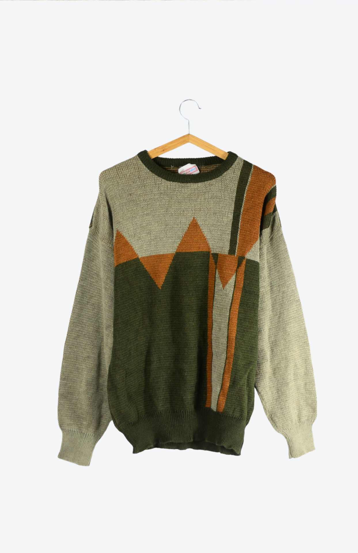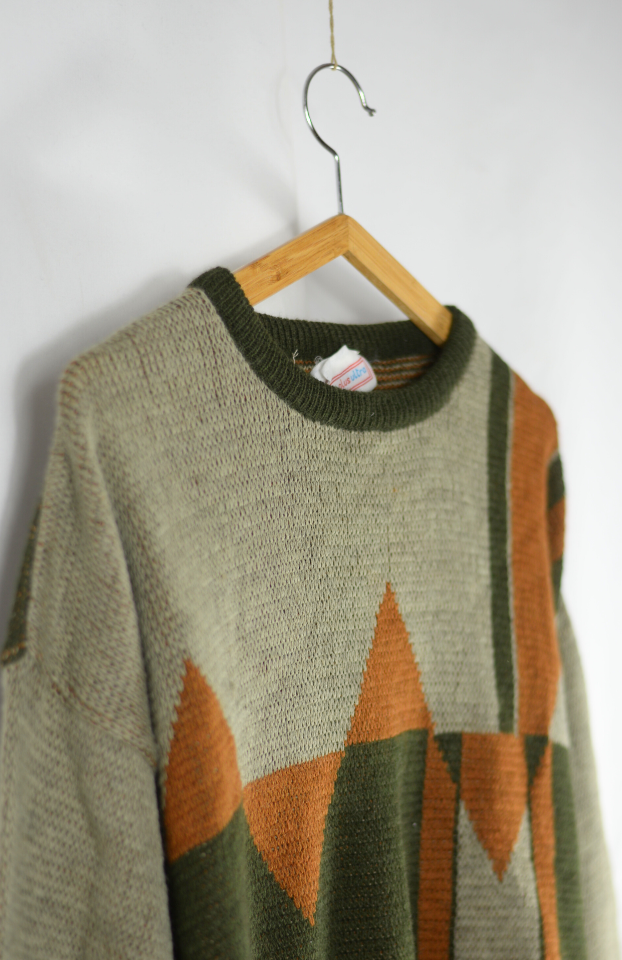 Vlněný zelený retro svetr s geometrií. Má lehce nabíraný rukáv a středně silný úplet. Pánský / unisex kousek.