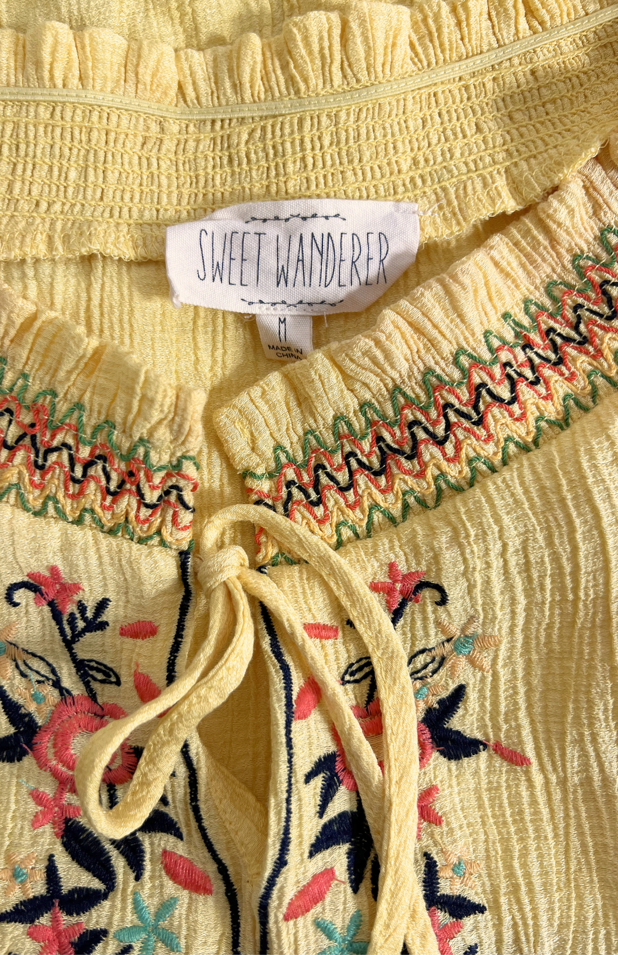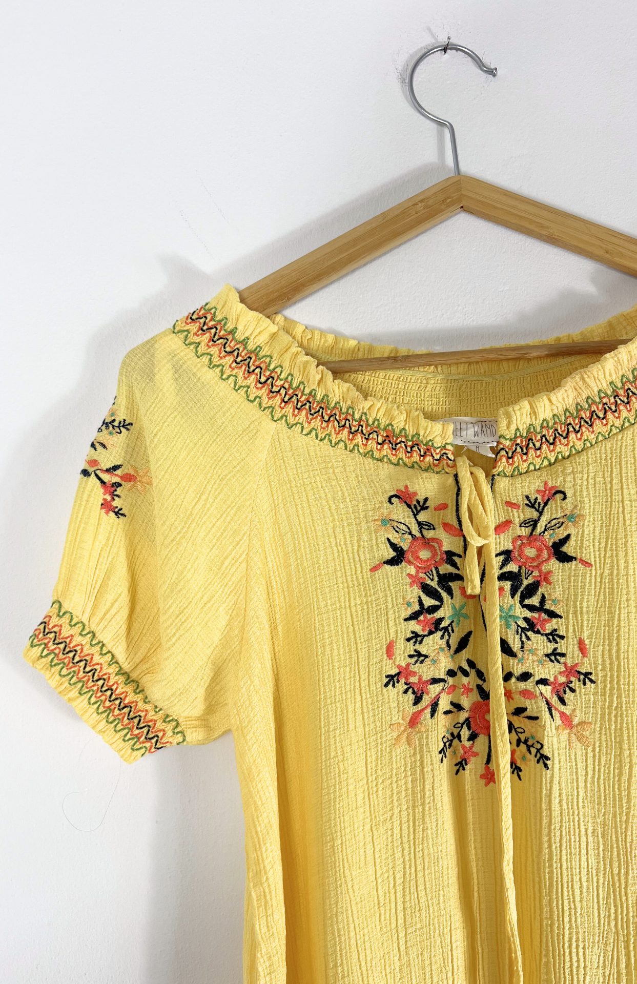 Máslově žlutý top a vázáním u krku a bohémskou barevnou výšivkou. Příjemné krepové plátno.