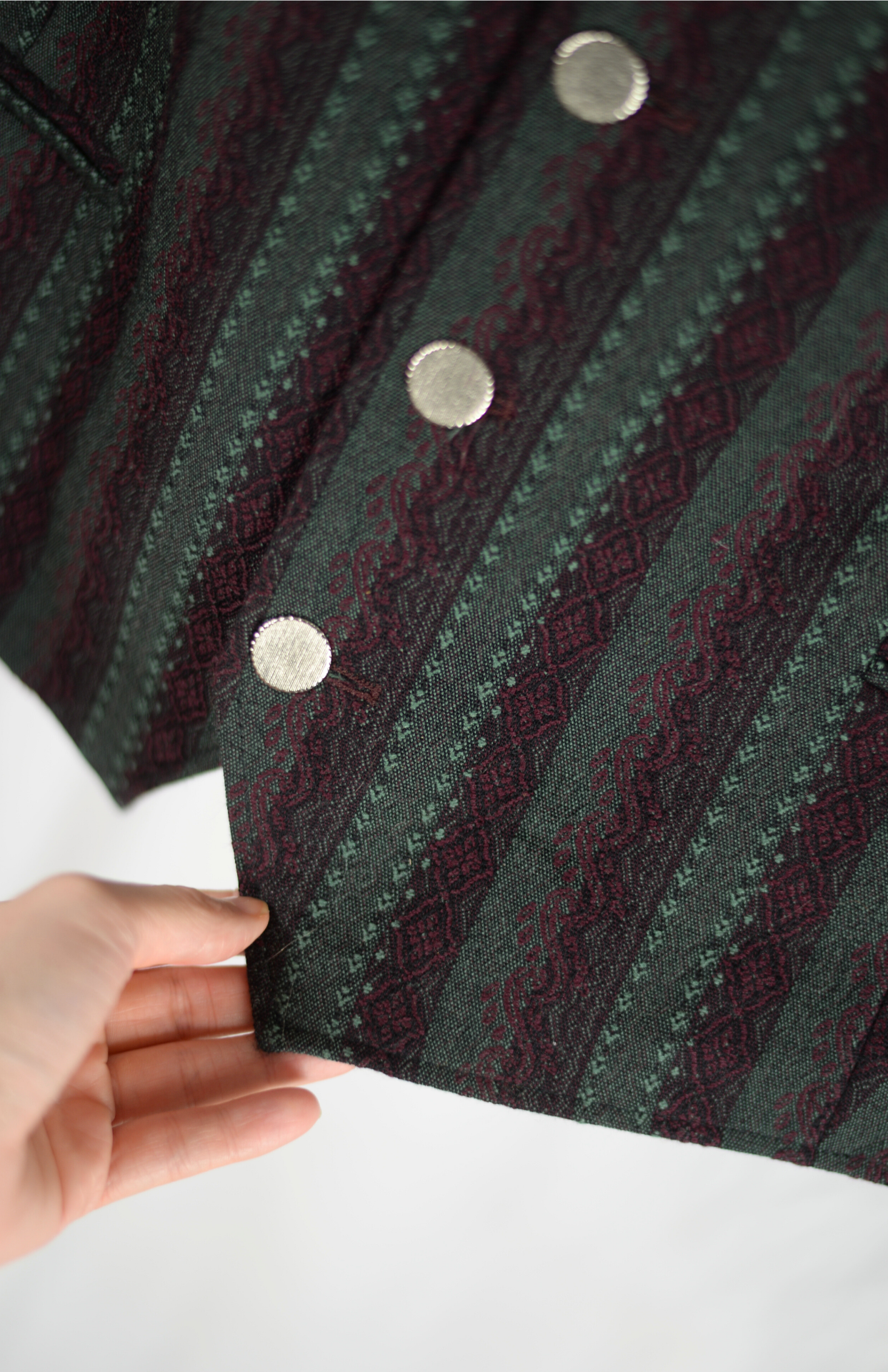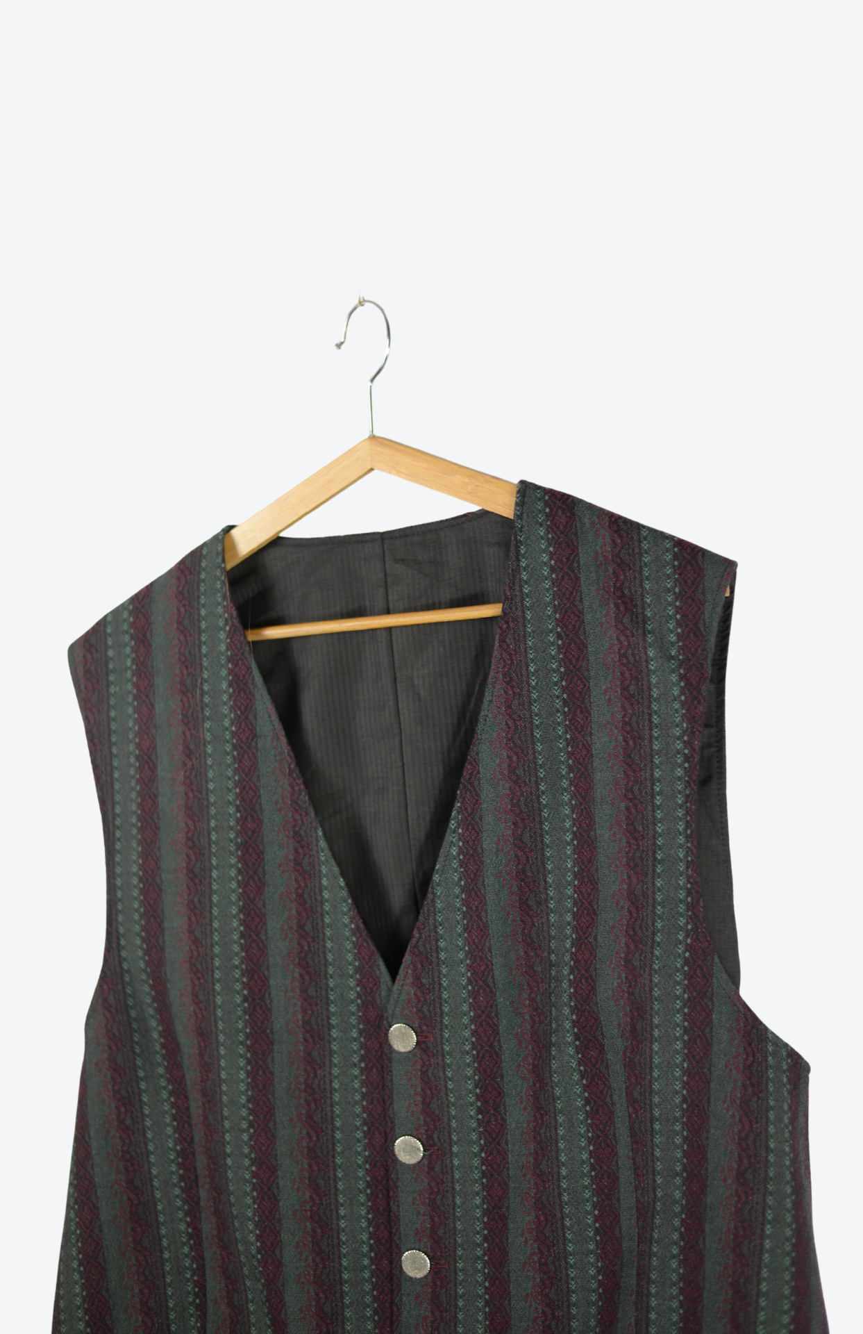 Vlněná vesta v tmavých decentních barvách a s kovovými knoflíky. Má jemný žakárový vzor a proužky. Vzor je na obou stranách. Po stranách mělké kapsy.