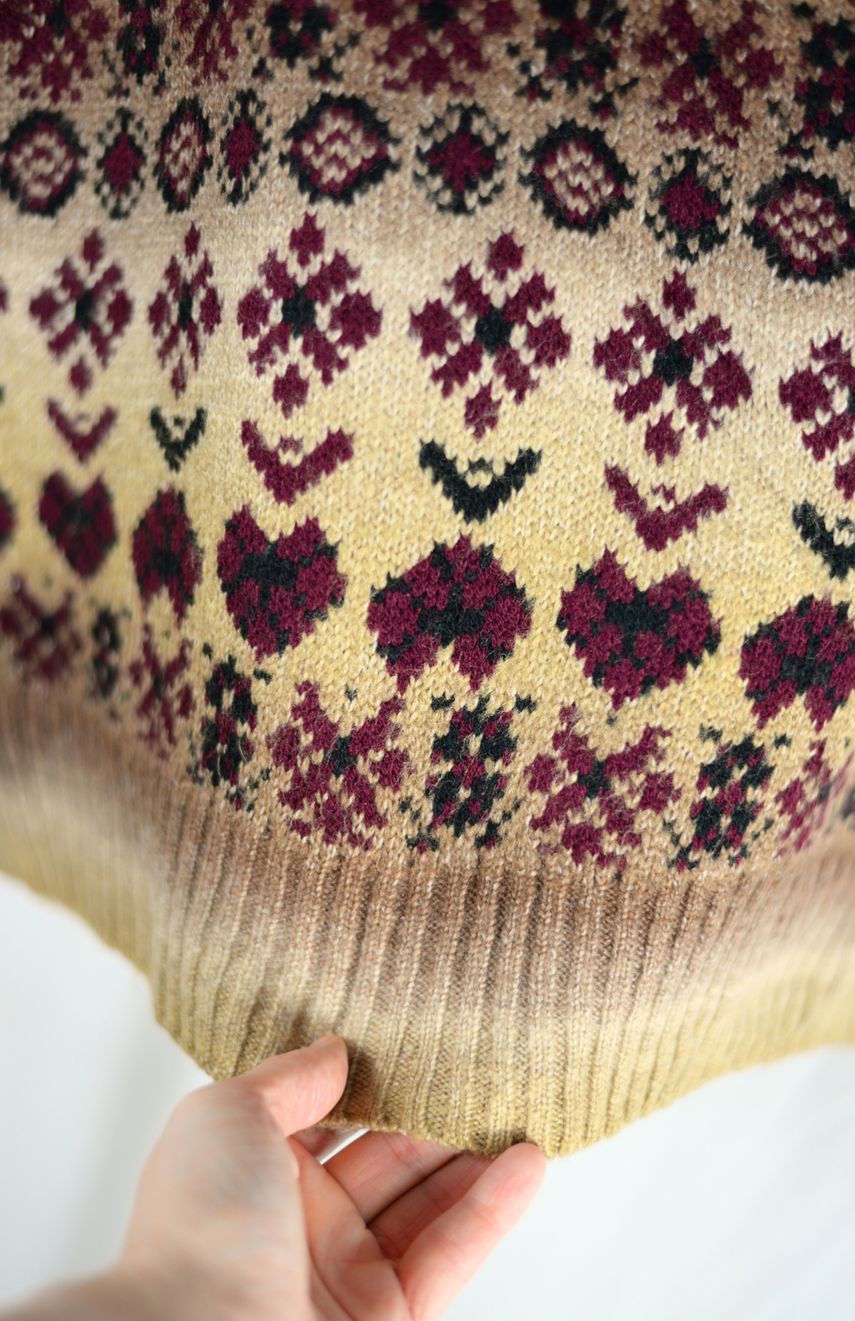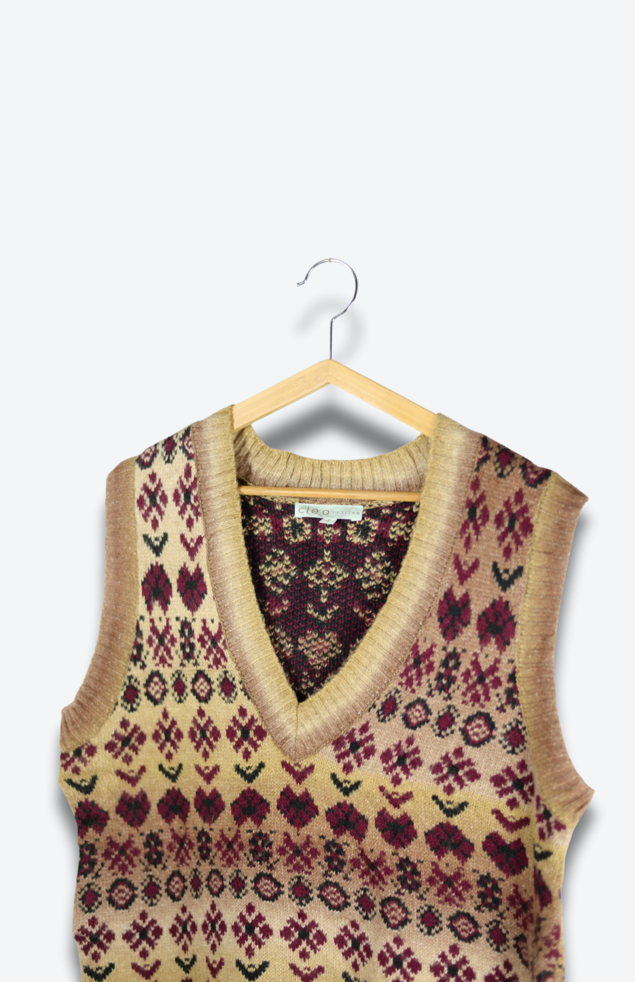 Příjemná funky vesta s roztomilým vzorem. Má výstřih do véčka a kratší střih - ideální k vrstvení na košile.Stav: Ve skvělém stavu, bez vad.Materiál: 91% akryl, 9% polyesterZnačka: Cleo Petites