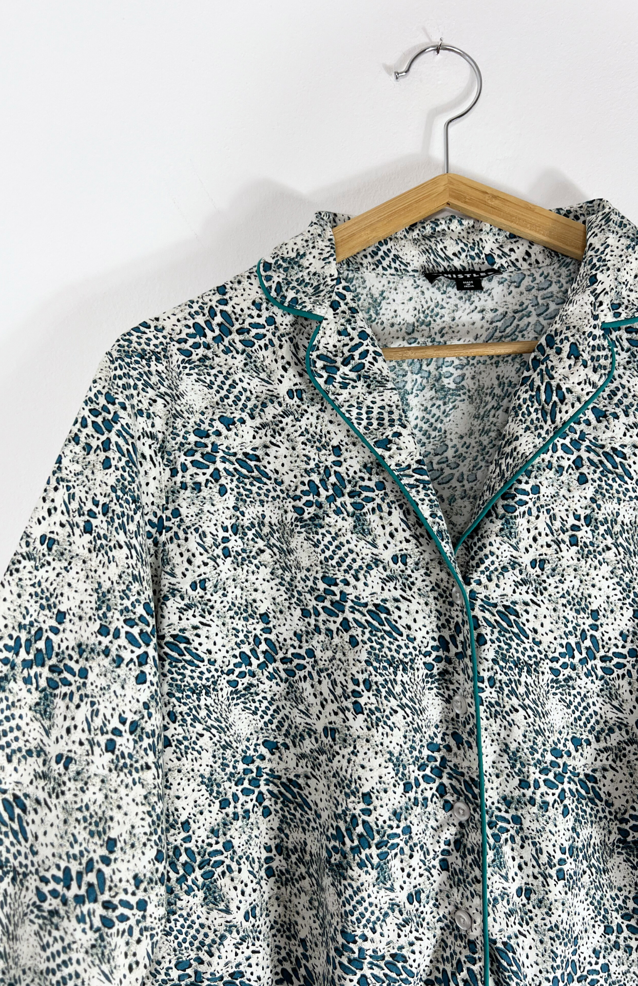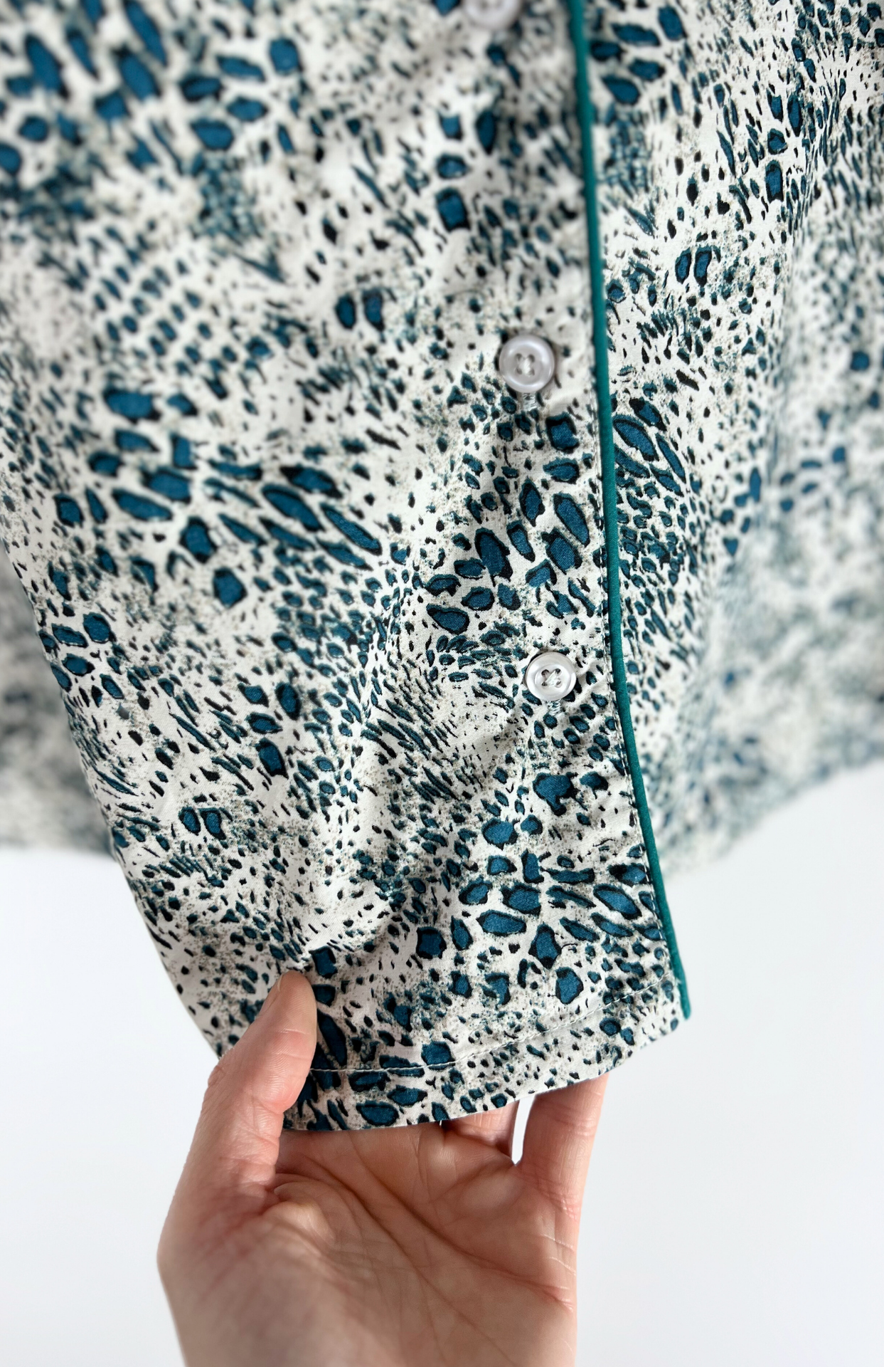 Košile s drobným vzorem ala leopard. Má petrolejové detaily a obšitý lem. Propínací na knoflíčky.