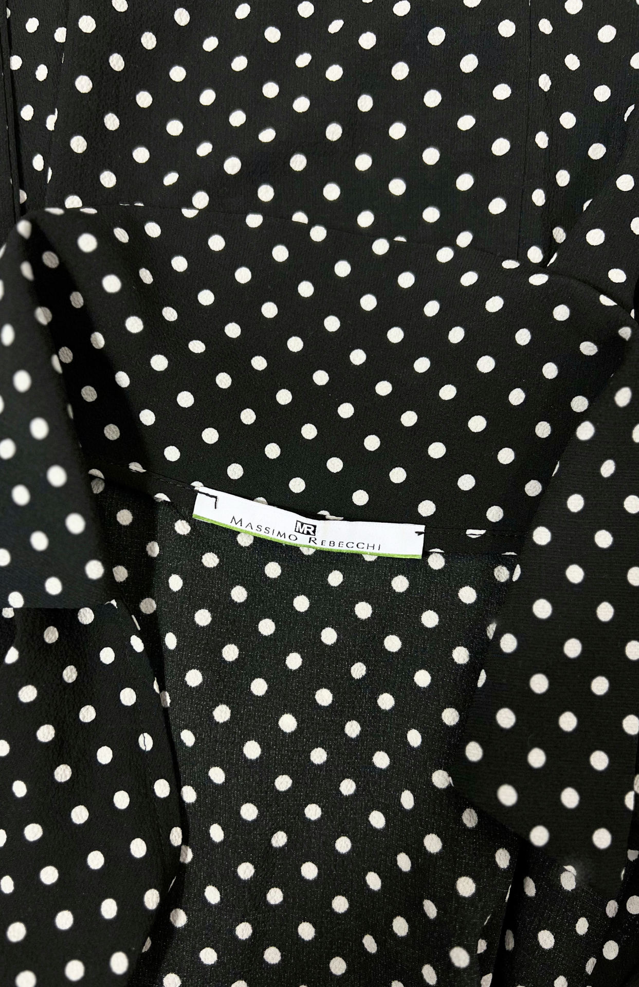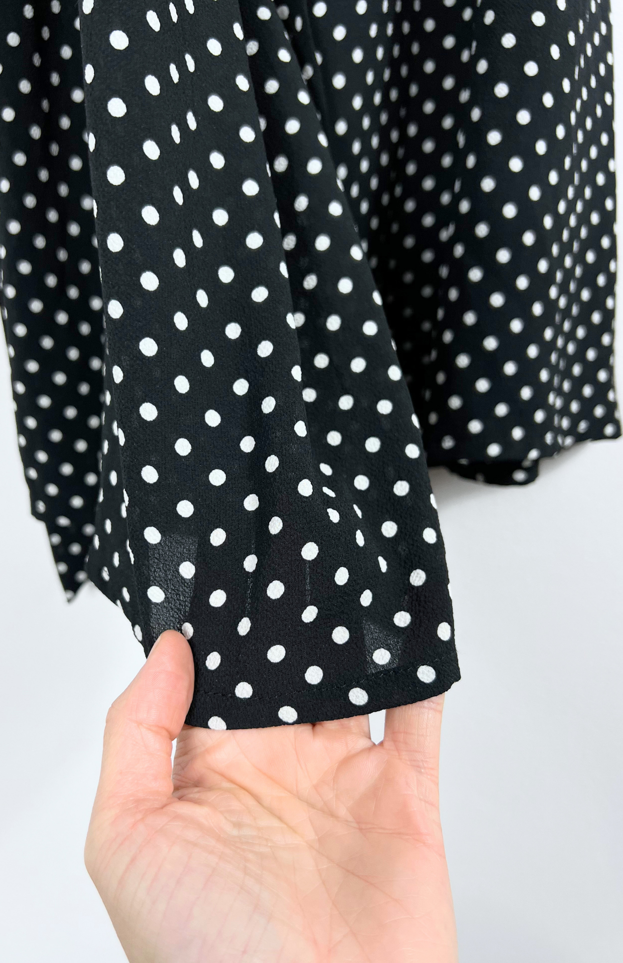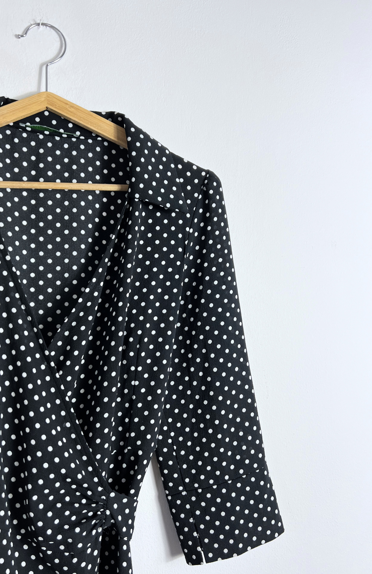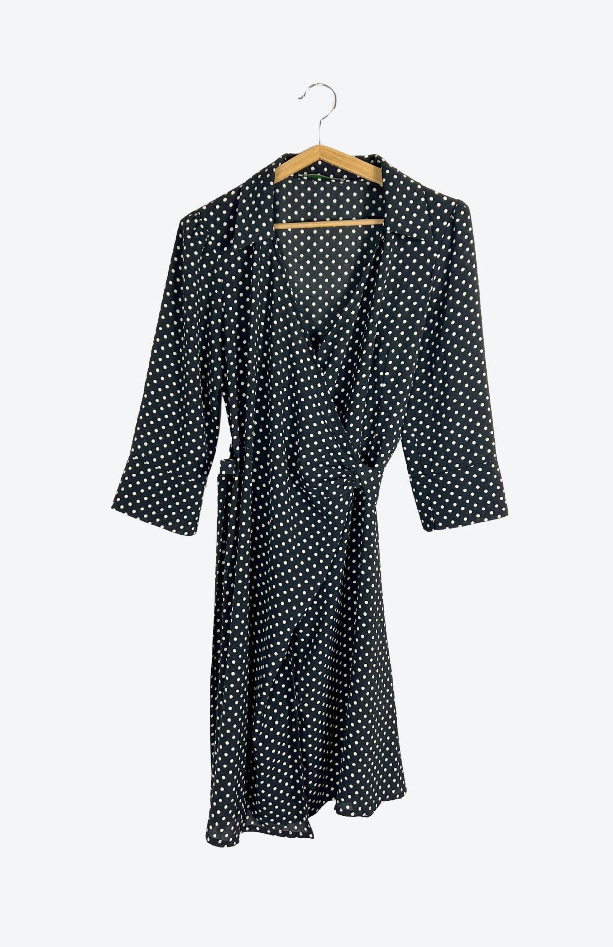 Zavinovací puntíkaté retro šaty. Mají košilový límeček a elegantní střih s vázáním na mašli na boku.