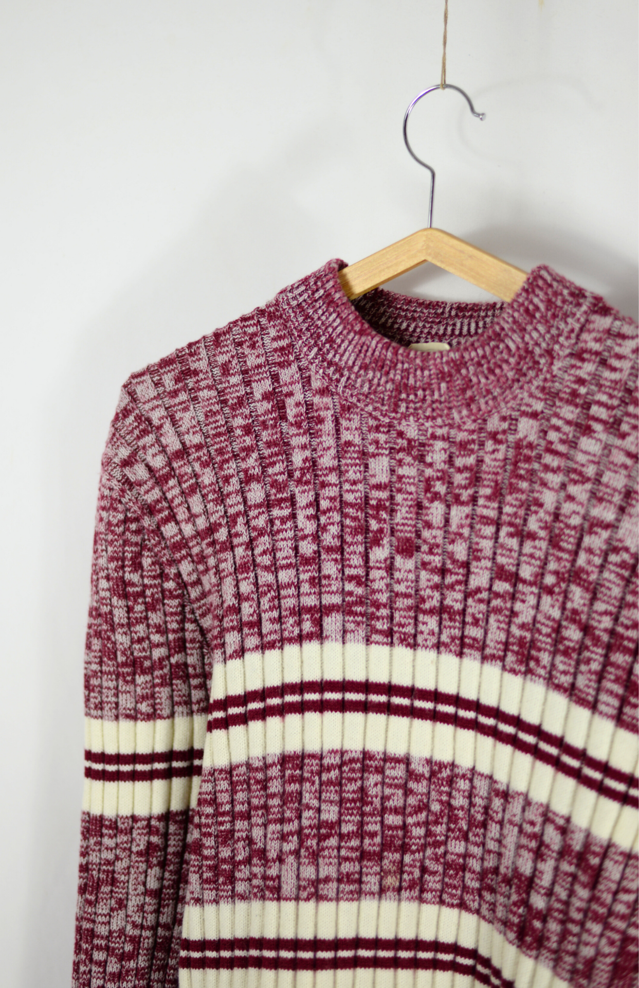 Žebrovaný svetr s krémovým proužkem a vínovým melírem.