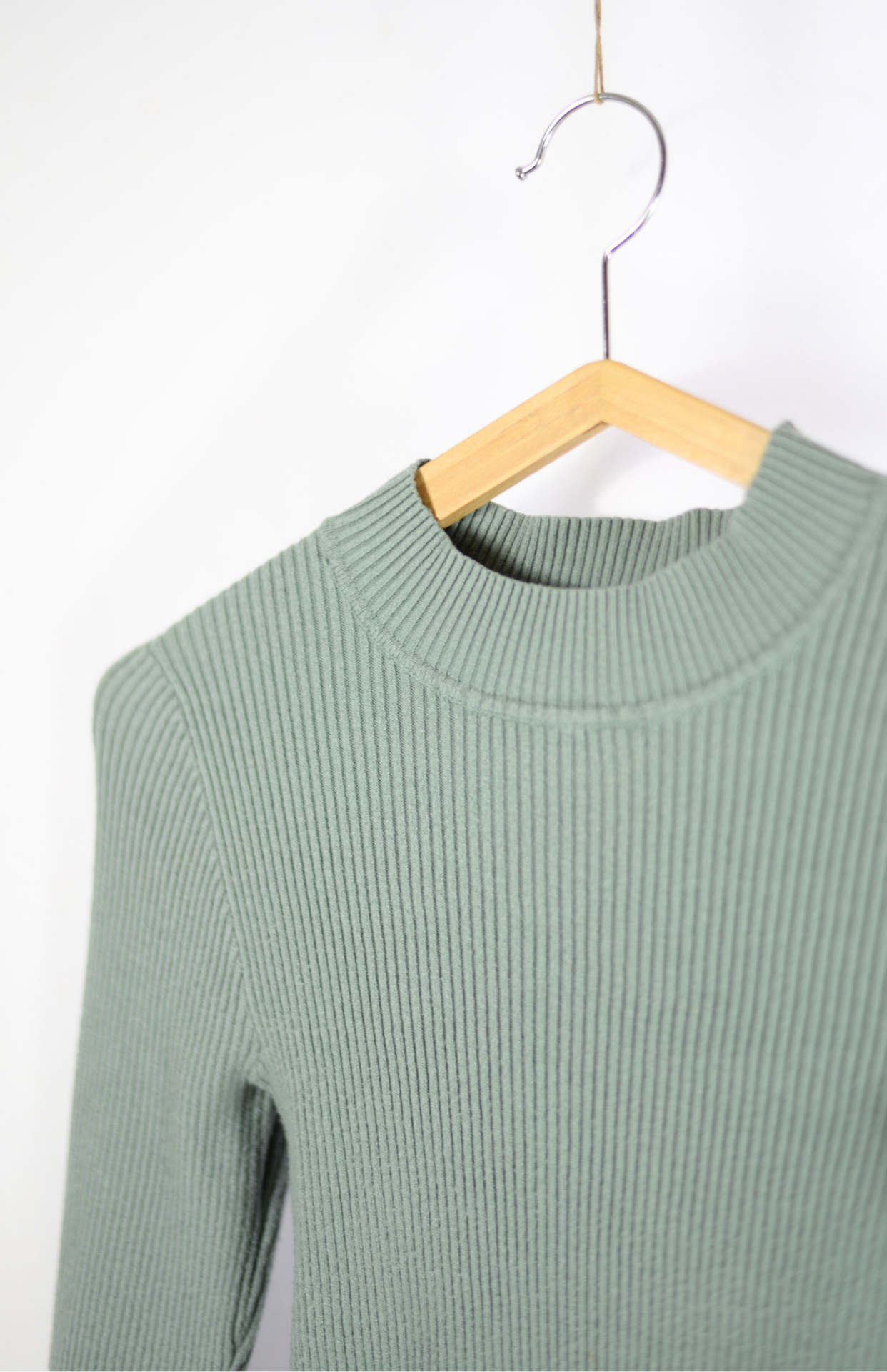 Žebrovaný svetr se stojáčkem. Pěkný odstín zelené. Má velmi pružný úplet.Stav: Ve skvělém stavu, pouze drobné známky nošení.Materiál: bez cedulky
