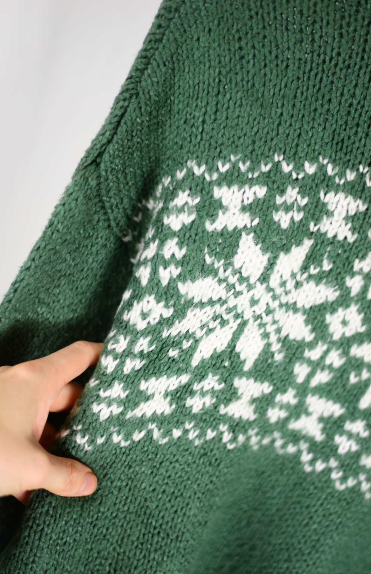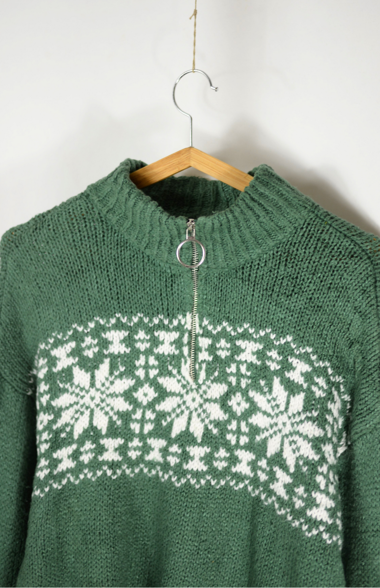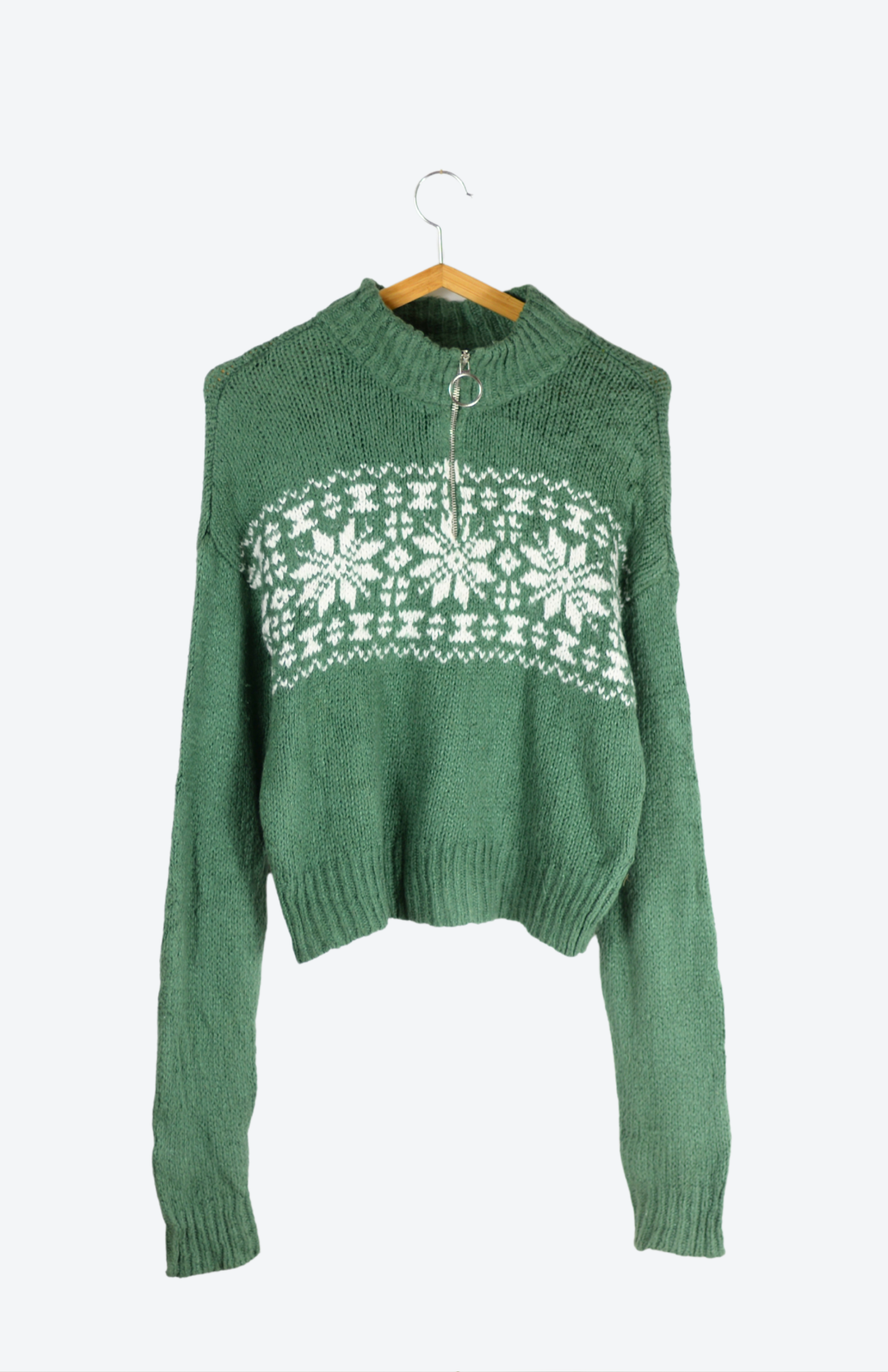 Zelený svetr se zipem a zimním vzorem. Má kratší střih a výrazný zip s kroužkem u krku. Středně silný úplet.